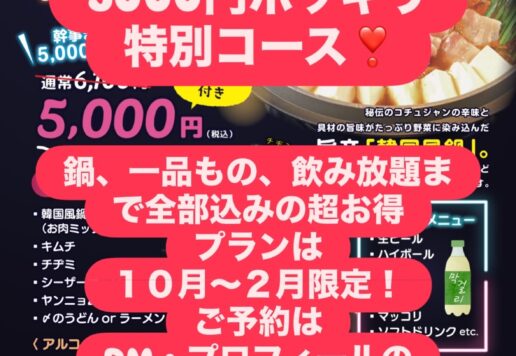 メイン料理に、「チーズタッカルビ」または、「韓国風鉄板焼(鶏、豚、ホルモン)」または、「韓国風...